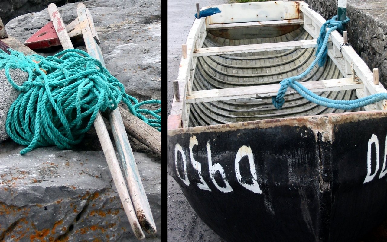 Inis Meáin - Currach and oars near the pier - noitice the narrow oar blades used on currachs. Also this currach has a Dublin registration!