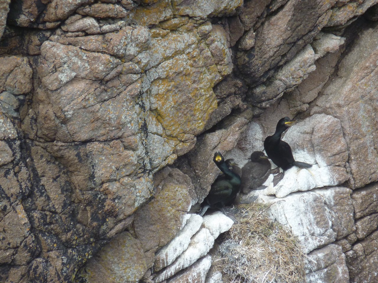 Inishirrer - nesting shags with chick amdst white guano on the low cliffs at the northern end of the island.